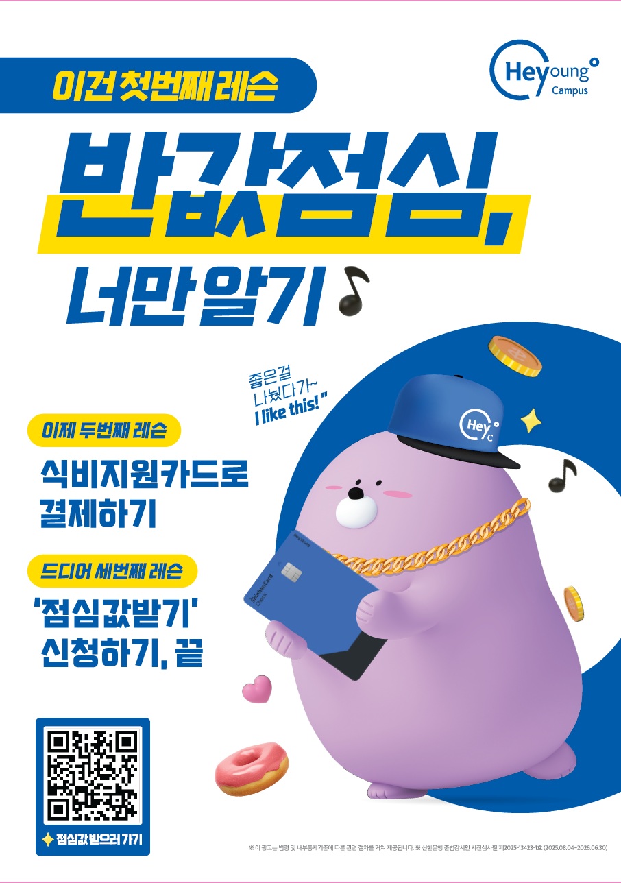 대학 생활에 필요한 모든 서비스를 하나로 통합한 플랫폼입니다. 앞으로 충청대학교의 수업 및 교내 서비스는 ‘헤이영 캠퍼스’ 앱을 통해 더 편리하게 이용할 수 있습니다. ① 반값점심 이벤트 교내·외 지정 가맹점에서 사용 금액의 50% 캐시백 (최대 3,000원) 매일 참여 가능합니다! ② 푸드트럭 무료 간식 이벤트 헤이영 앱을 보여주면 무료 간식 증정! - 일시: 2025년 10월 17일(금) 오전 10시~ - 장소: P동 교수연구동 입구 |