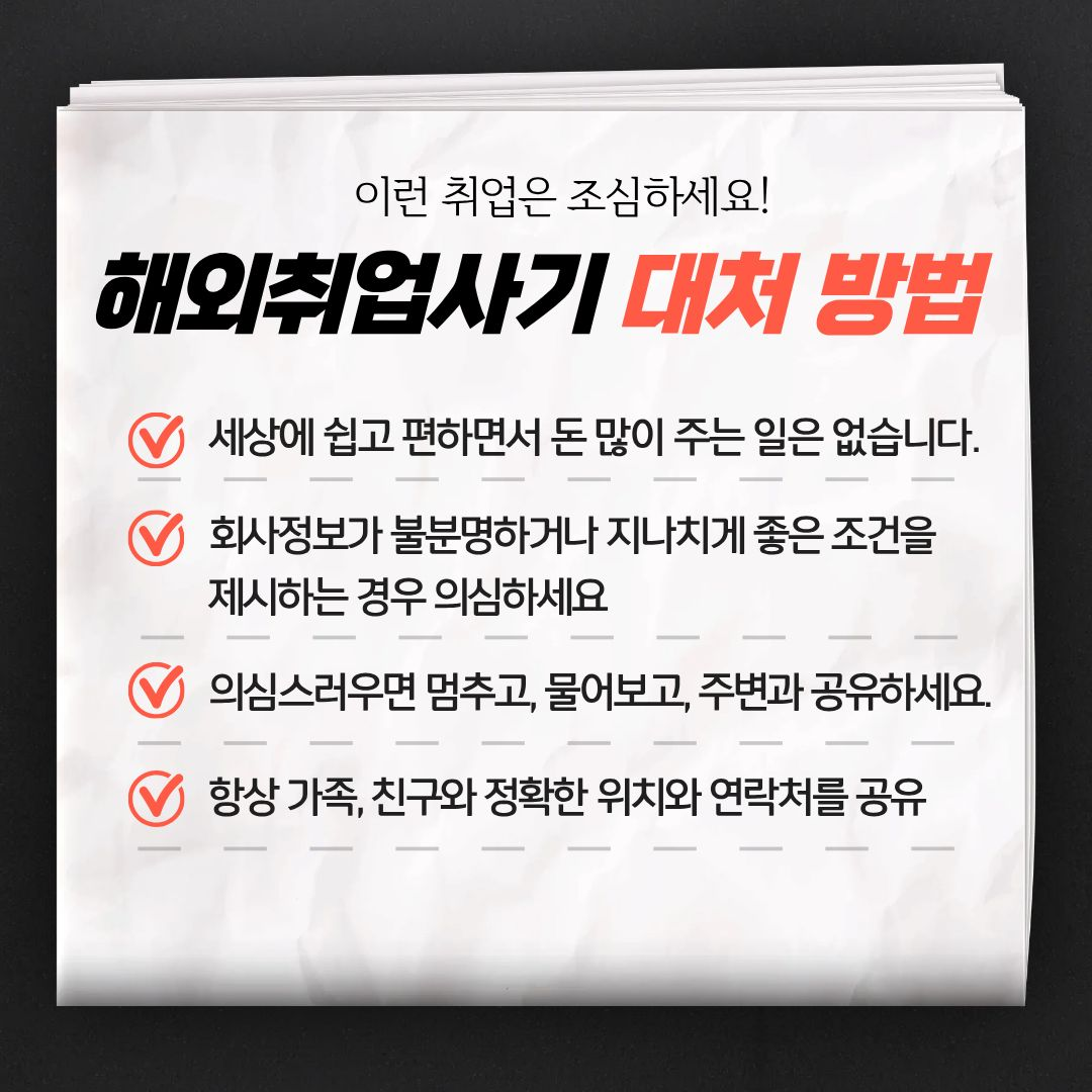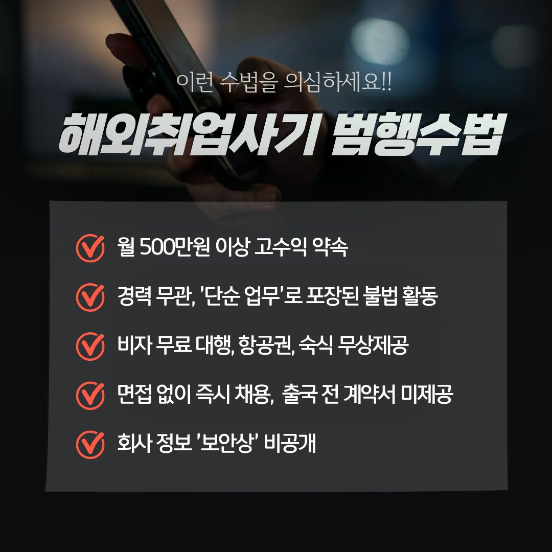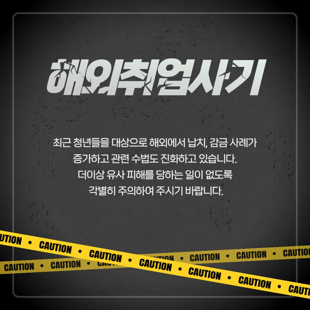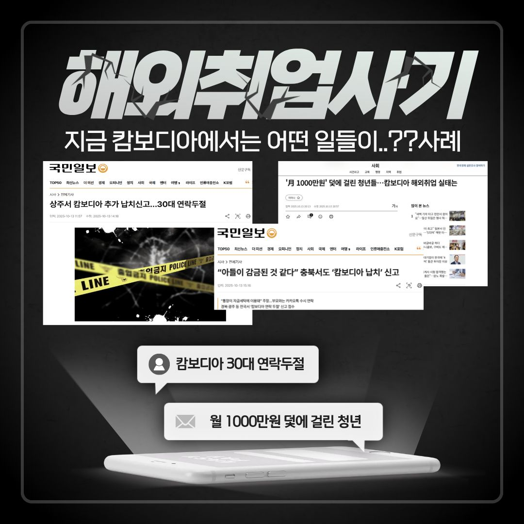 일반공지 학생공지 일반공지 장학/학자금 공지 감염병안내 공모/모집/시험 도서관 생활관 기부금공개 업무추진비공개 보육교원연수원 기타공고 충청대학교_대표-학생공지(대표_충청마당_공지사항_학생공지) 상세보기 - 제목, 내용, 파일, 작성자, 조회수, 작성일, 학과공지, 주소링크 정보 제공 [노란화분] 해외 취업 사기 범죄 예방 안내 작성자 : 이정민 작성일 : 2025-10-23 조회 : 73 최근 해외 취업 사기 범죄가 심각합니다. 주의하세요. 파일 png 문서 캄보디아 범죄 예방1.png png 문서 캄보디아 범죄예방 2.png png 문서 캄보디아 범죄예방 3.png png 문서 캄보디아 범죄 예방 4.png png 문서 캄보디아 범죄예방 5.png 주소링크 목록 게시물삭제 광고 반복작성 욕설 본인삭제 게시물삭제 다음글 【취업허브센터】 2025년 졸업특화프로그램 『인적성 시험 꿀팁 대방출 프로젝트』 운영 안내